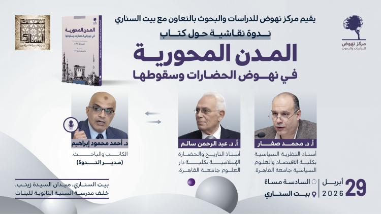 يدعوكم مركز نهوض للدراسات والبحوث لنقاش حول كتاب "المدن المحورية"، وذلك في الندوة التي تقام في بيت السناري بالقاهرة، يوم الأربعاء 29 أبريل 2026، الساعة 6 مساء.