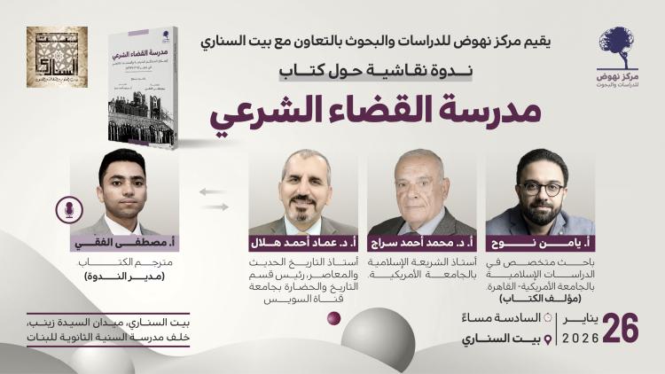 ينظم مركز نهوض بالتعاون مع بيتِ السناري ندوةً نقاشيةً حول كتاب «مدرسة القضاء الشرعي»، وذلك في إطار اهتمامه بتعميق الحوار العلمي حول قضايا التشريع الإسلامي وتاريخ المؤسسات القضائية.